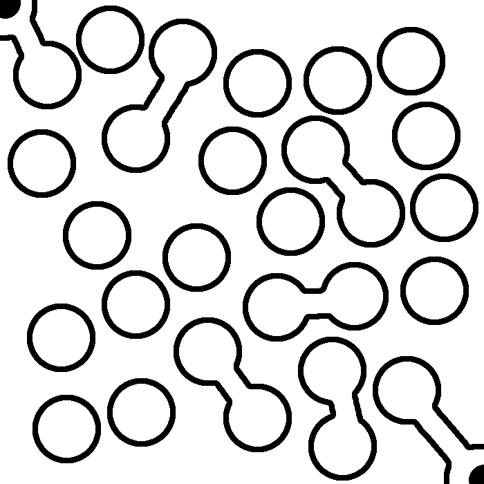 Following black lines, travel between discs in upper right and lower left corners.